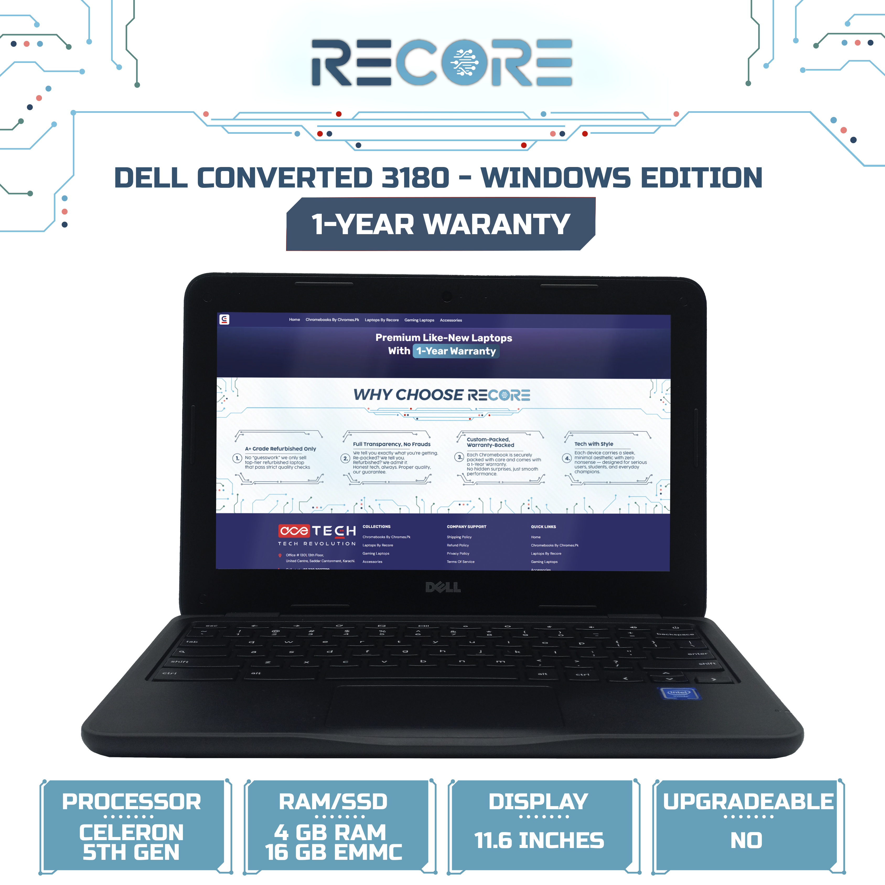 Originally a Chromebook, now upgraded with Windows — this Dell 3180 brings everyday computing to life in a compact, no-nonsense design. Its 11.6" display, spill-resistant keyboard, and durable build make it perfect for students, remote workers, and anyone who needs a reliable device on the move. Thanks to the Windows conversion, you get the flexibility to run essential apps and software without limitation. It’s powered by energy-efficient Intel hardware, with eMMC storage for snappy performance in a lightweight body. Certified A+ grade under Recore’s strict testing standards and backed by a 1-year warranty, the Dell 3180 is a smart, affordable choice — made even smarter with Windows onboard.